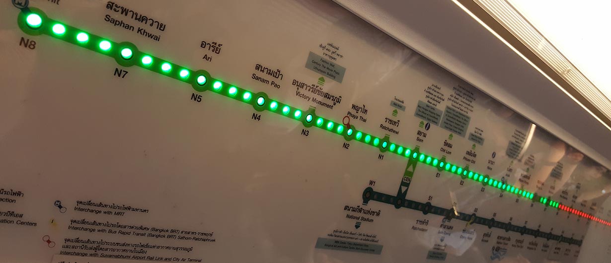 A long name of the operator of the BTS. The BTS is a public transport, the name Skytrain reveals that it is an aboveground course. There are two lines, the Sukhumvit Line and the Silom Line. Together, the Skytrains are 28km long and the track is built entirely on stilts.